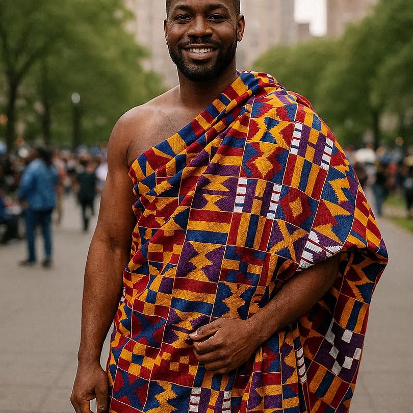 Regal full Kente sets for men. Draped stoles & wrappers in bold red, blue, yellow, purple, white patterns. Handwoven in Bonwire. Perfect for ceremonies, photoshoots, or cultural pride. Authentic craft. Supports Ghanaian legacy.