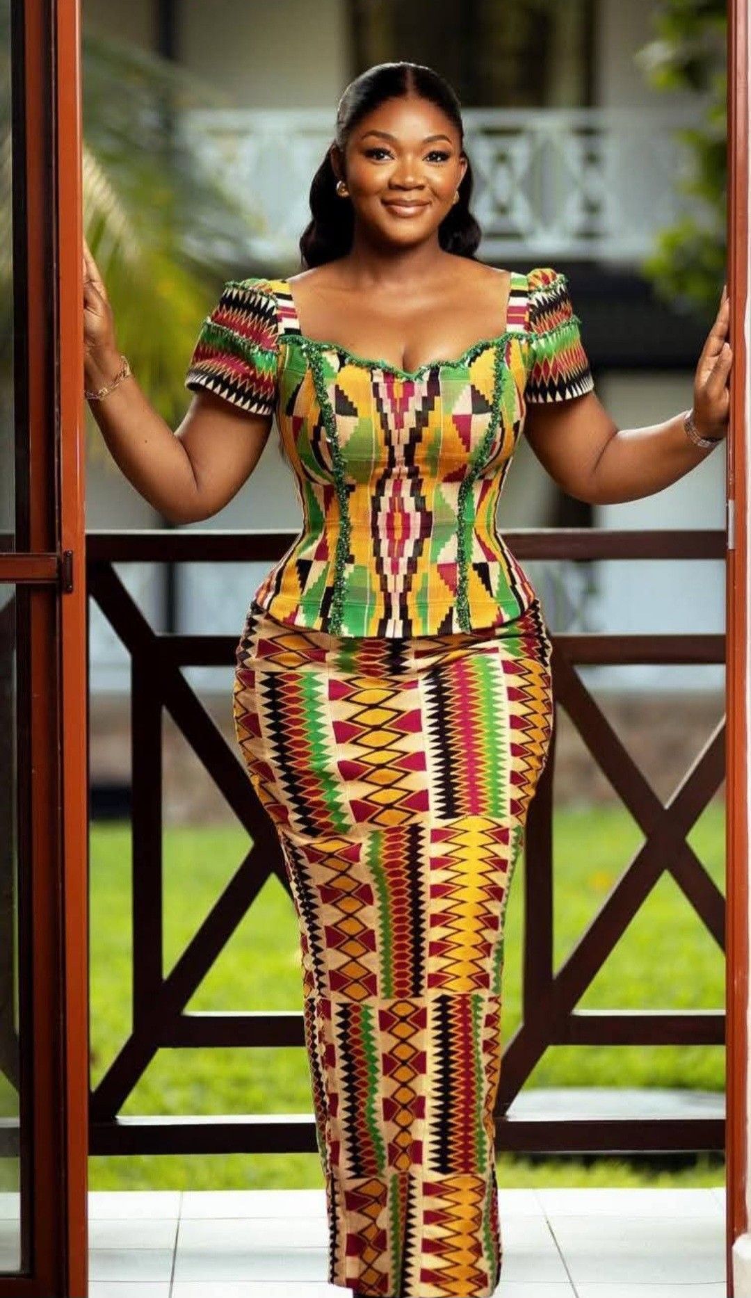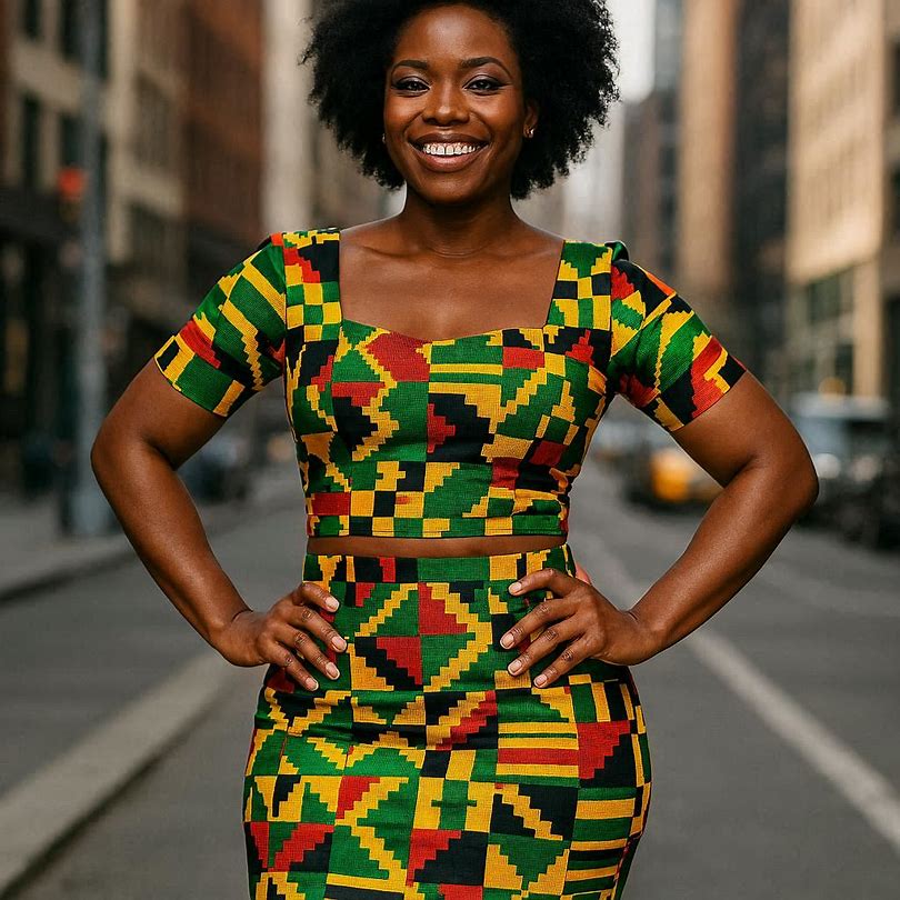 This two-piece Kente ensemble features a fitted top and pencil skirt, handwoven in Bonwire with authentic GI-certified Kente cloth.